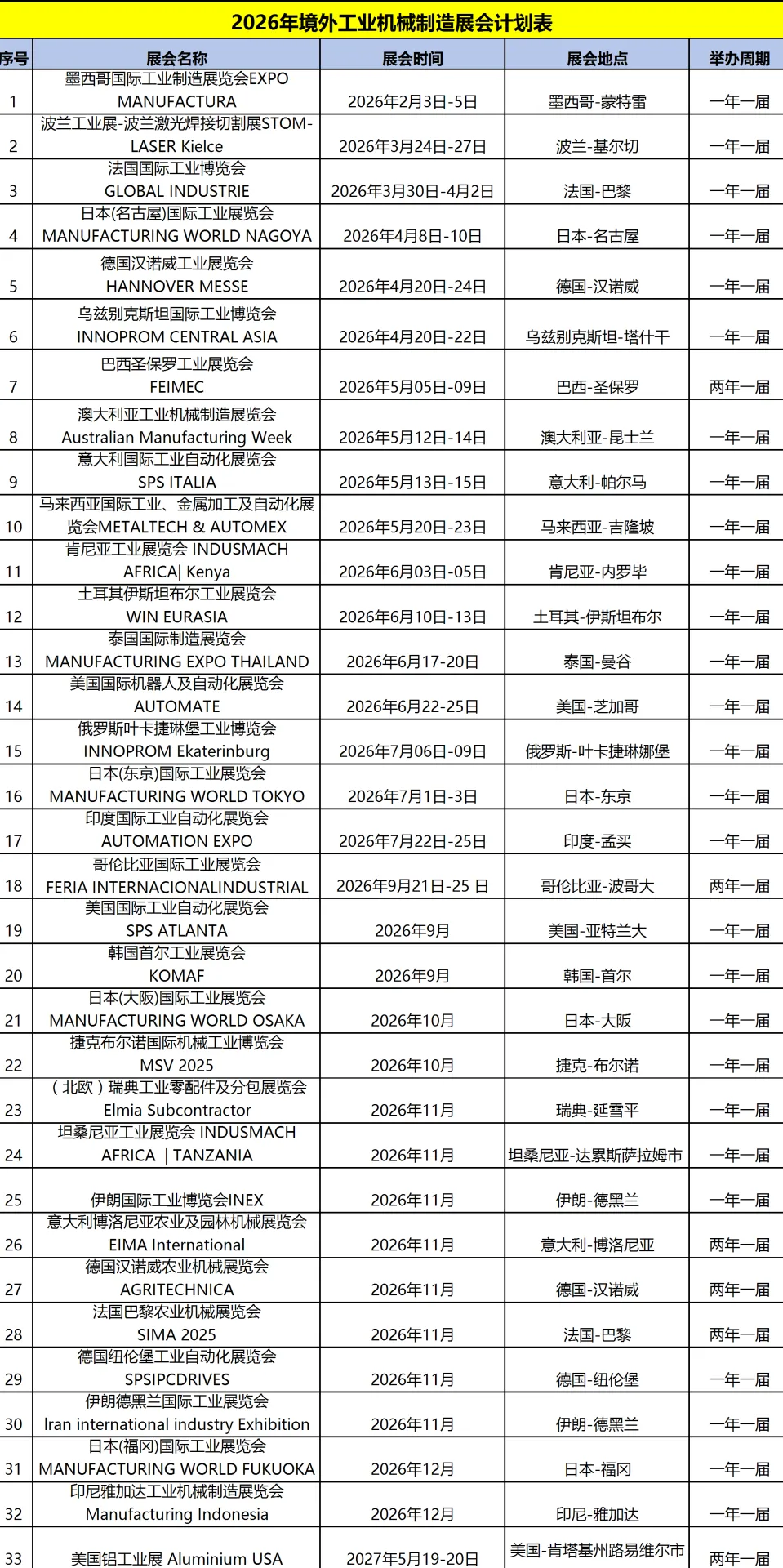 2026年全球工业机械制造展览会计划表