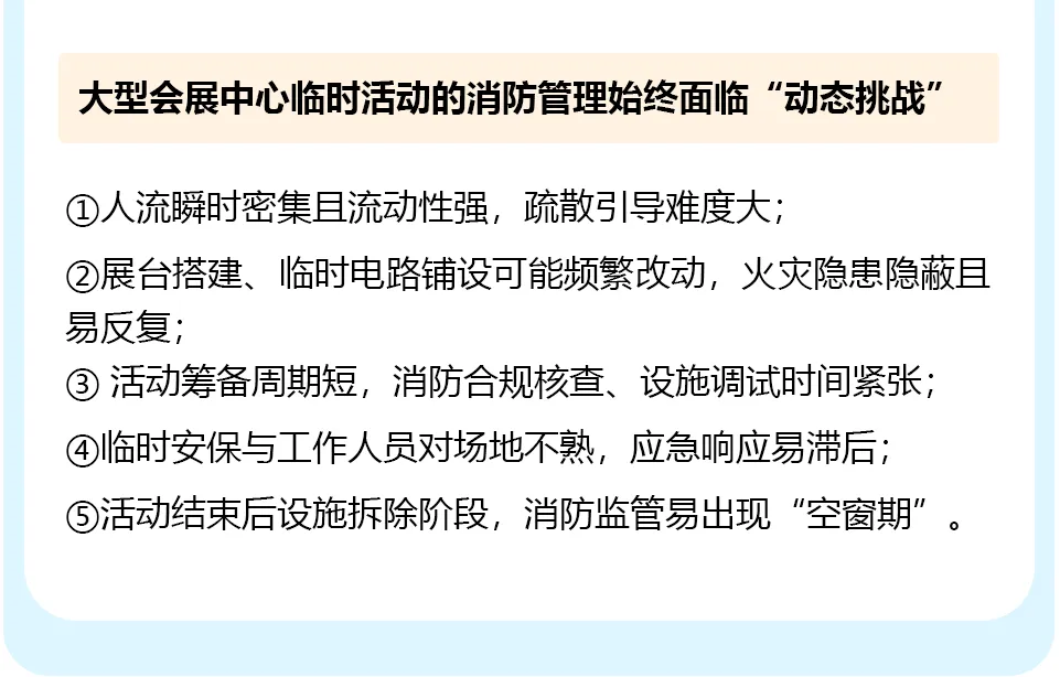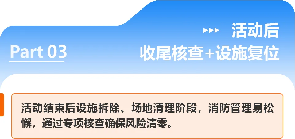 确认会展中心原有消防设施是否恢复原状,通道是否清理畅通,设备运行是否正常,核查记录同步归档,形成“活动全周期消防管理闭环”;