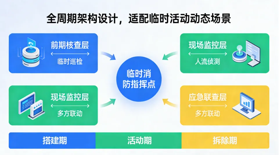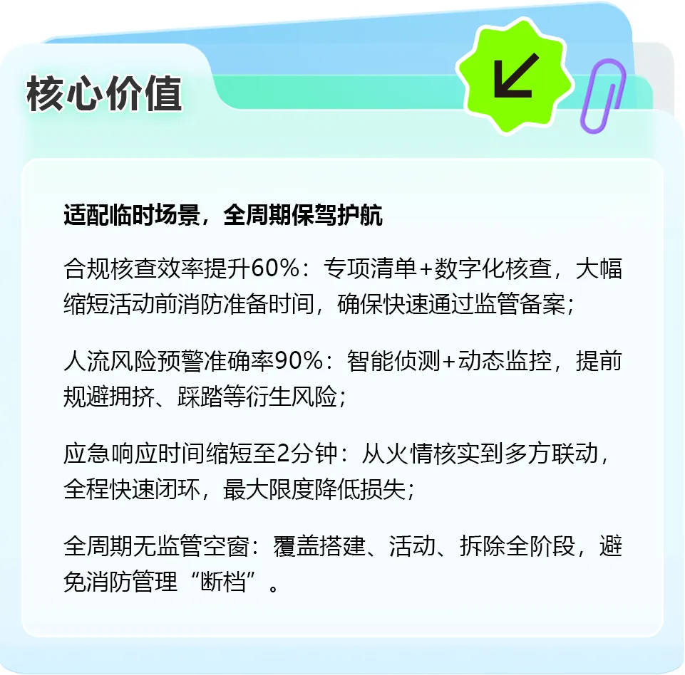 今天为大家带来大型会展中心临时活动专属消防解决方案,整合“临时专项巡检+人流智能监控+快速合规核查+动态应急联动”核心能力,覆盖“活动前-活动中-活动后”全周期,实现临时场景消防保障“精准、高效、无死角”!