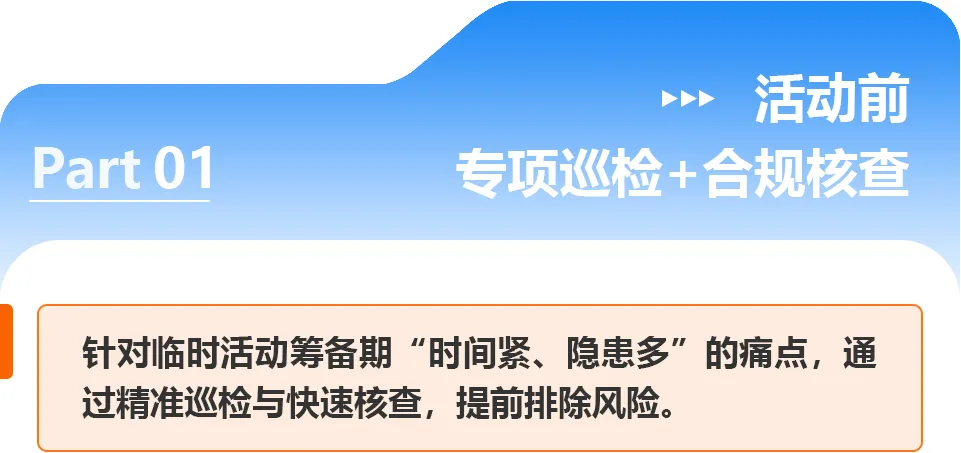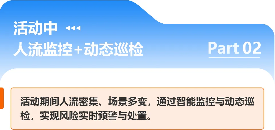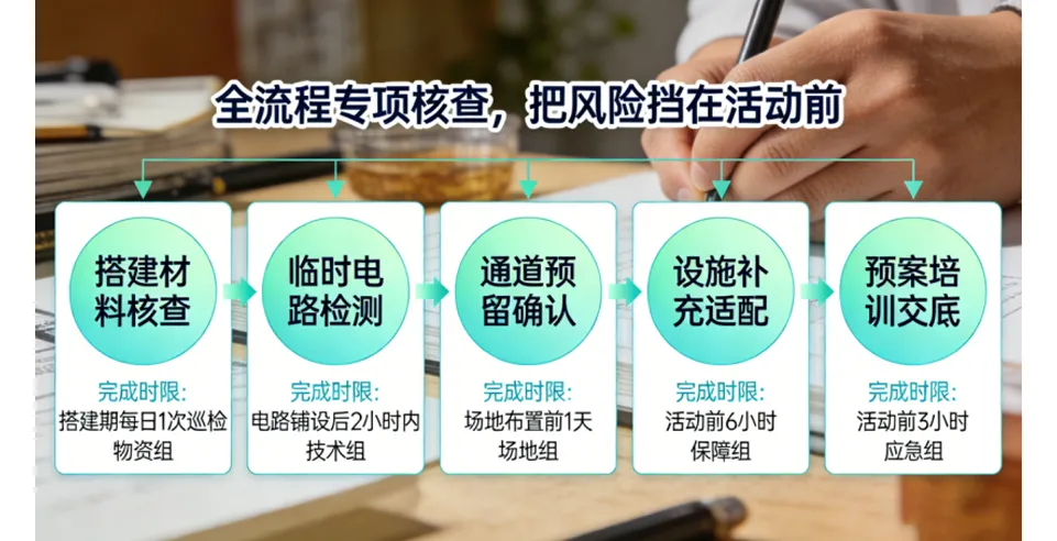 系统生成定制化巡检清单,安保人员通过手机终端逐项核查、拍照留痕,发现问题立即推送至活动策划方与搭建团队,限期整改闭环,杜绝“带险搭建”;