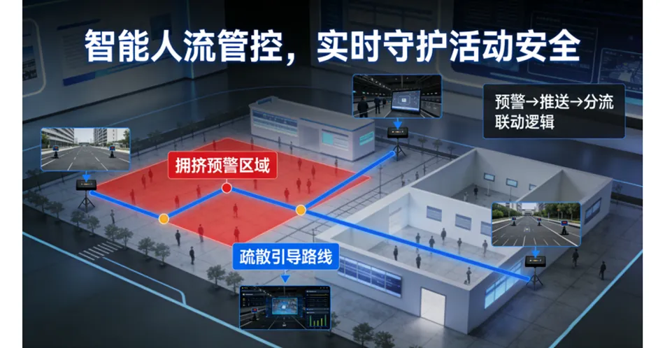 在展厅入口、通道转角、扶梯口等关键位置部署高清摄像头,开启“人员拥挤侦测”“人流密度统计”功能,当区域人流超过安全阈值,立即向临时指挥点推送预警,同步联动现场广播、显示屏播放分流提示,引导人员疏散,避免拥挤踩踏与局部缺氧;