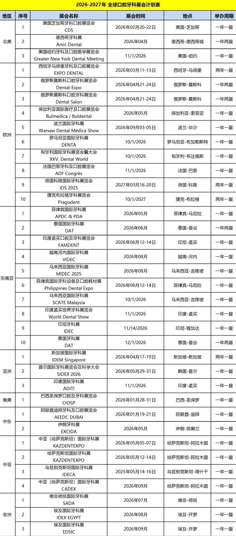 2026-2027年全球牙科展会计划表