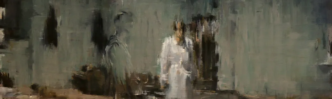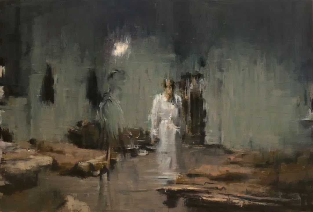 这位旅居巴黎的艺术家以克制的青绿色调作画,通过刮擦、涂抹、打磨画面表层,创造出游走于存在与消散之间的发光幽灵体。无论是如《迷惘一》(2025)中漂浮在翠绿深渊的身影,还是如《预兆一》(2025)里从黑暗中隐约浮现的轮廓,他笔下的人物总在显形与消逝的瞬息间徘徊。每幅画都像一场降灵仪式,谢雷在其中召唤着幽魅的幻影。