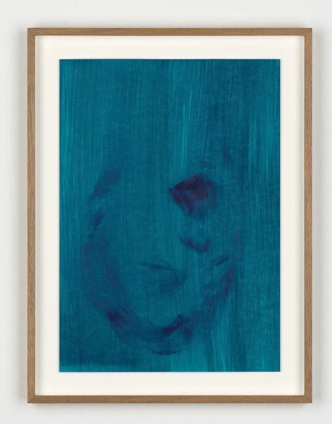 奥达·图恩戈德的《幽灵记忆》(2021)将其标题具象化:这是一幅幽灵般的绘画,三个蓝色的轮廓似乎从各自的身体中漂浮而出。这位挪威艺术家的许多绘画描绘了日常场景,采用明亮的调色板;她的人物形象闪闪发光,仿佛悬浮在两个世界之间。
