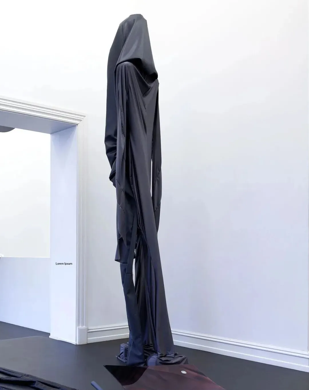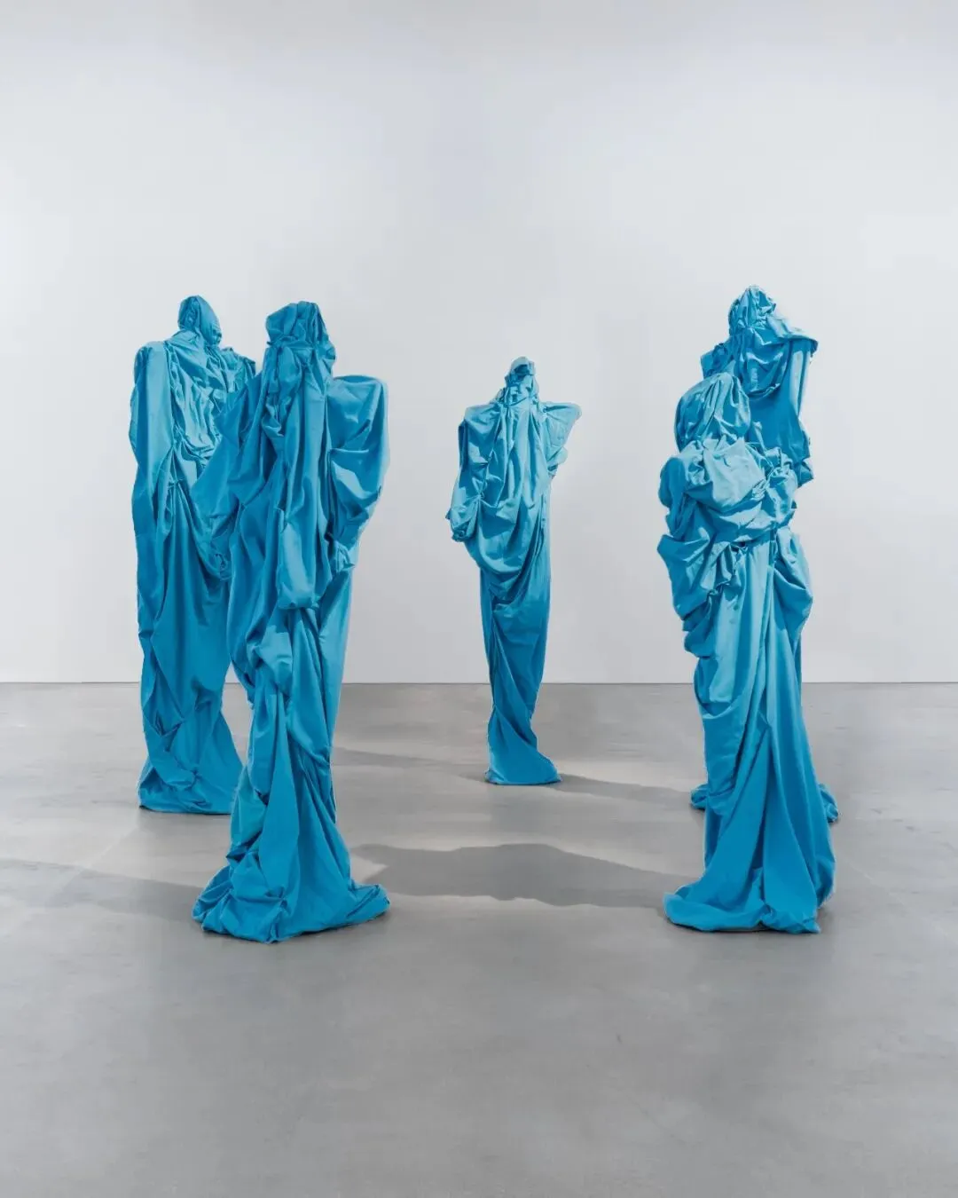 穆金加通过她所有的雕塑和装置作品传达了这一理念,尽管幽灵在她的人形雕塑中最为直接地出现。例如,《展开与修复》(2024)展示了四个令人不安的人形,由覆盖蓝色布料的钢铁构成。"我在思考黑人身体如何被视为具有威胁性,以及这如何会对其造成真实的危险,"她继续说道。穆金加目前在阿姆斯特丹斯特德利克美术馆的"皮肤相贴"展览中展出 55 个这样的哨兵——这是 Artsy 必看的美术馆展览之一,展期至 2026 年 1 月 11 日。