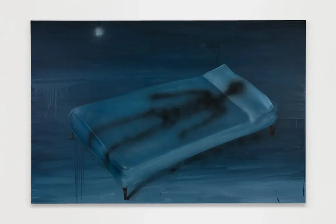 他与 PEANA 画廊合作的当前个展"我梦想得太多,以至于我不再属于这里"中的绘画作品都以同一个幽灵人物在不同情境中出现为特色。在《游乐场》(2025)中,这个人物在秋千上推着一个枕头,而在《千夜》(2025)中,它以诡异的剪影形式躺在床上。这些超自然场景展现了被一个无目的地漂流的幽灵所居住的日常生活,这个幽灵在世间游荡,毫无目的,却无法放弃它曾经认识的世界。