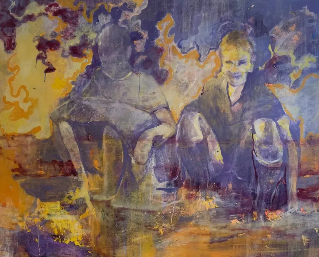 在许多情况下,图恩戈德的人物是半透明的。在《湿漉漉的脚》(2025)中,两个男孩并排坐着,但他们的轮廓模糊并溶解到绘画的金色和蓝色背景中。有时,图恩戈德使用一种令人联想到幽灵般存在的涂抹技法。例如,《第 24 页》(2022)描绘了秋千上两个被涂抹的身体。