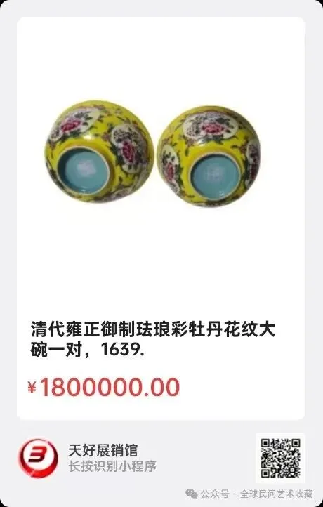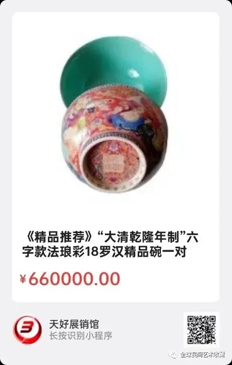 “大清乾隆年制”六字款法琅彩18罗汉精品碗一对,尺寸如下:高)6.7x15.3(直径)x7(底足)cm。瓷器爱好者无人不晓,康/雍/乾清三代珐琅彩瓷器,烧造于宫廷内务府,皇帝和督陶官亲自参与,其数量有限,质量上乘。这一对彩碗,是珐琅红底加18罗汉人物像,人物造型灵动/各异,此外,还有代表皇帝的金彩龙一条,梅花鹿一只,包括祥云等,寓意皇帝福/禄/寿。此对碗~内地为松石绿釉,人物图案包括口沿下/底足上方回形纹图案,均有金彩描绘。最能说明问题的是底足文字内容,不仅有红字乾隆官款,而且有一行醒目的红字,内容是:“贺大清乾隆皇帝六十六大寿内務府奉旨督陶烧造”,21个字。可想而知,这一对珐琅彩碗,应该是(1777年)内务府为乾隆皇帝66岁,祝寿而特别烧造的艺术珍品。2022年12月7曰,经天好评审团评审,以6票优势荣登精品榜,获第六十六期天好海选精品。来源:1159.V。