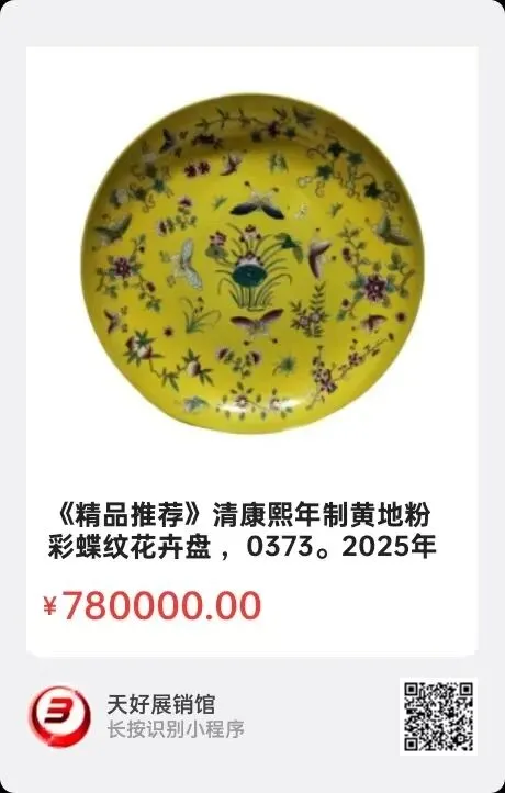 清康熙年制黄地粉彩蝶纹花卉盘 , 雅星軒藏 口径43.8cm 高7.5cm 此大盘底色为明亮的黄色,盘心及盘壁满绘蝴蝶、牡丹、荷花、桃花、南瓜、藤蔓等吉祥图案。纹饰绘制精细,色彩绚丽,布局饱满,具有典型的中国传统装饰风格。因此,整个图案充满了吉祥长寿、富贵喜庆的美好寓意。黄地作为一种底色,在历史上是等级较高的宫廷用瓷常见制式。此盘边沿微小块有收复 。2025年 11月5日,经天好评审团评审,以6票优势荣登精品榜,获第189期天好海选精品。来源0373.V。