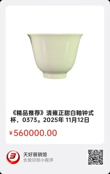 清雍正甜白釉钟式杯 ,雅星軒藏 口径8cm 高6.5cm 此杯属于颜色釉品类中的白釉,虽然不如珐琅彩、粉彩等彩瓷炫目,但纯净的单色釉瓷器最能体现官窑对胎土、釉水、窑火的极致追求,雍正官窑以胎釉精良、造型秀雅著称于世,在收藏市场中地位极高。是资深藏家尤为青睐的品种,艺术价值和学术价值很高。2025年 11月12日,经天好评审团评审,以7票优势荣登精品榜,获第190期天好海选精品。来源0373.V。