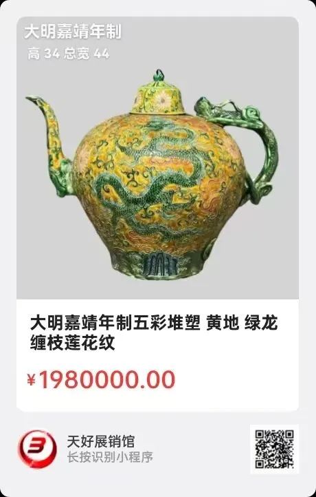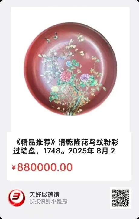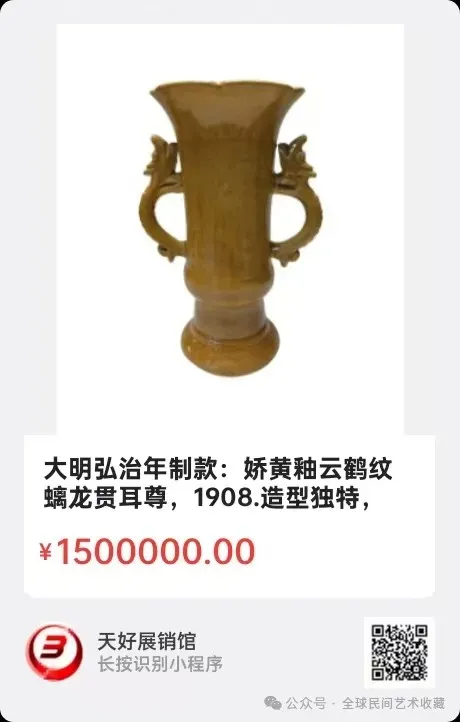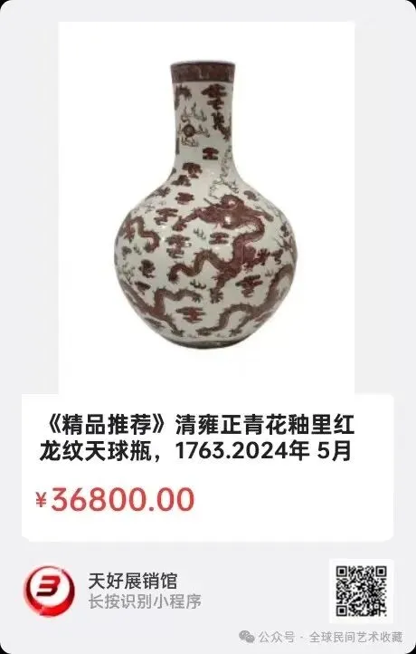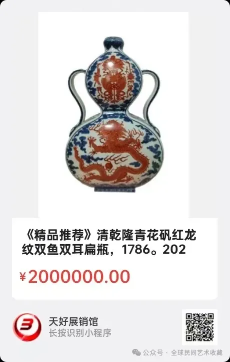 清乾隆青花釉里红梅瓶,高46.4厘米,口径10.3厘米,底径20厘米,瓶肩直径31.2厘米,重量9kg。在清代,明黄是皇家专用色,普通百姓不可使用,由御窑厂工匠对釉料配比和窑温的精准把控才能烧成。青花釉里红梅瓶将青花和釉里红呈现在同一件瓷器上,体现出当时烧造瓷器的高超技艺。青花枝蔓缠绕不绝,釉里红花瓣形态饱满美观,缠枝花卉纹寓意“生生不息、福寿延绵”,这是皇家高级审美,是当时国力与技艺的见证。2025年 11月12日,经天好评审团评审,以8票优势荣登精品榜,获第190期天好海选精品。来源1975.V。