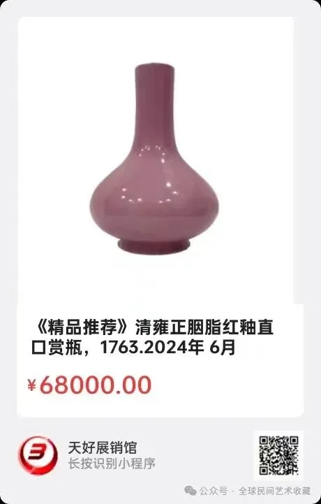 清雍正胭脂红釉直口赏瓶,此藏品为雍正胭脂红(胭脂水)釉赏瓶,以微量金 作着色剂、在炉内经 800℃ 左右烘烧而成的低温红釉。由于这种红料是从欧洲转入,雍正十三年(1735年)督陶官唐英所撰《陶成纪事碑》中称之为 “西洋红色器皿” 。其釉中含万分之一、二的金,在清朝又名 “金红”,深受雍正皇帝喜爱,且在本朝质量达到顶峰,后朝均无其项背。该瓶底款书写青花“大清雍正年制”楷书款,字体隽秀,高33公分,口径7公分,底足14公分,堪称黄金比例,不失为陈设之佳器。2024年 6月 5日,经天好评审团评审,以8票优势荣登精品榜,获第129期天好海选精品。来源1763。V.