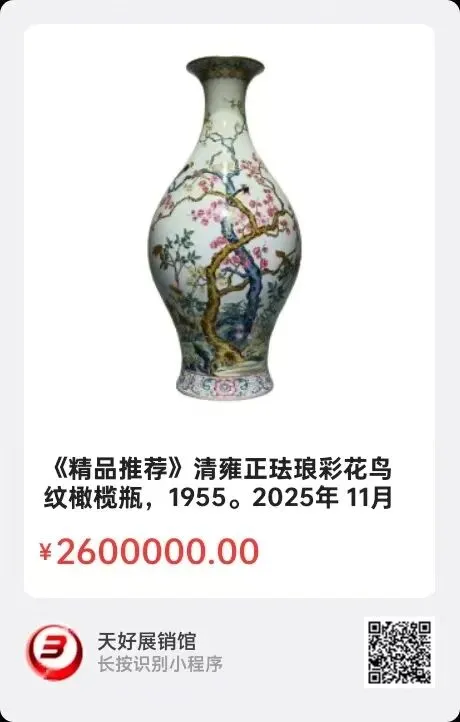 清雍正珐琅彩花鸟纹橄榄瓶,规格:口径9.9cm,高40.5cm,足径12cm,2025年 11月5日,经天好评审团评审,以8票优势荣登精品榜,获第189期天好海选精品。来源1955.V。