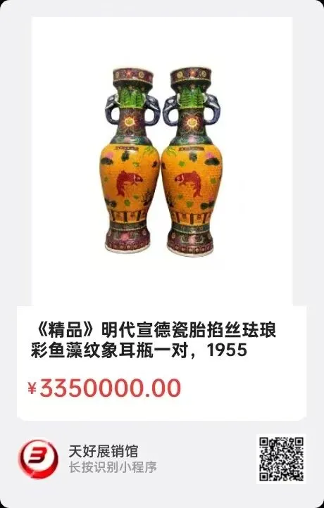 明代宣德瓷胎掐丝珐琅彩鱼藻纹象耳瓶一对,尺寸如图,2025年 11月26日,经天好评审团评审,以8票优势荣登精品榜,获第192期天好海选精品。来源1955.V。