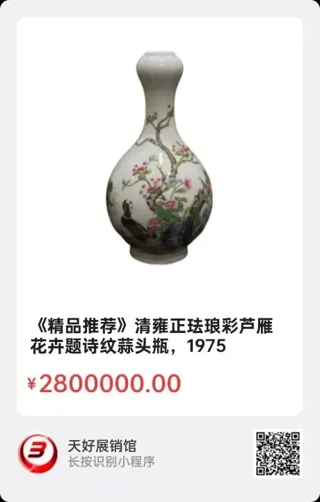 清雍正珐琅彩芦雁花卉纹玉壶春瓶,高16.5厘米,口径4.3厘米,腹径10.8厘米,底径5.1厘米,瓶颈部修长,瓶腹圆润饱满,线条流畅优雅,整体造型优美。瓶身绘有三只鸿雁,羽毛以棕、灰、白等色彩晕染,形态生动;周围环绕着山石、牡丹、菊花、绿色枝叶等自然景观纹饰,图纹线条细腻,色彩过渡自然,饱满且富有层次感。瓶身对应图纹的背面配有题诗和红色款章,是清代雍正珐琅彩瓷器图文并茂的一个特征。珐琅彩是清代康熙晚期创烧的彩瓷品种,以色彩柔和、绘画细腻著称,常以花鸟、山水等题材入画,兼具观赏与收藏价值。2026年 1月7日,经天好评审团评审,以6票优势荣登精品榜,获第197期天好海选精品。来源1975.V。