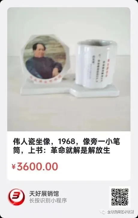 伟人瓷坐像,1968,像旁一小笔筒,上书:革命就解是解放生产力,革命就是促进生产的发展。底板:15.80cmx6.60cm,8品,来源1279.V.