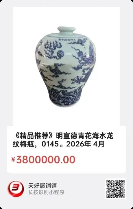 明宣德青花海水龙纹梅瓶,尺寸;高32cm, 腹径22cm,口径6.6cm, 底径15.6cm。此梅瓶(是国外回流的)上绘有传统的青花图案,包括龙、云纹和波浪等元素,这些图案在中国传统文化中具有吉祥的象征意义。图案绘制精细,线条流畅,展现了高超的绘画技艺。青花瓷器的苏麻离青在白色瓷胎上显得非常鲜明,色彩对比强烈,苏麻离青釉料的老化痕迹明显。瓷器的形状古朴典雅,瓶身比例协调,线条简洁流畅,具有典型的中国传统瓷器的风格。特别是底部的乾隆御笔铭文给此青花梅瓶增添了不可估量的历史价值和艺术价值及收藏价值。从底胎可以确认明显的老化痕迹。总的来说,这件带有苏麻离青图案和铭文瓷器底部展示了中国传统瓷器的精湛工艺和非常高的艺术价值。2026年 4月1日,经天好评审团评审,以6票优势荣登精品榜,获第204期天好海选精品。来源0145.V。