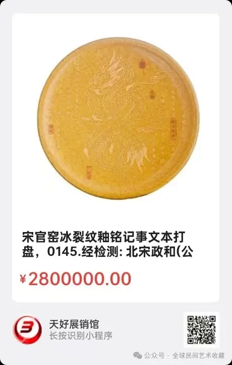 宋官窑冰裂纹釉铭记事文本打盘,藏品尺寸: 口径46cm 高4.5cm,经检测: 北宋政和(公元1111)御制。来源0145.V.