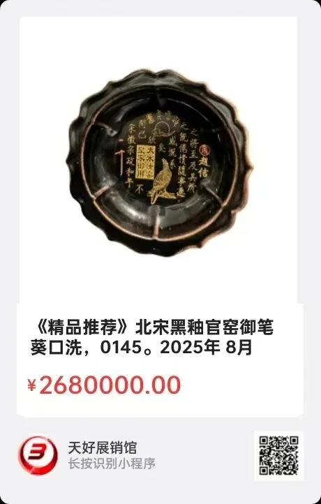 北宋黑釉官窑御笔葵口洗,藏品尺寸: 口径19cm 底径12.5cm,高5.5cm,2025年 8月 6日,经天好评审团评审,以6票优势荣登精品榜,获第182期天好海选精品。来源0145.V。