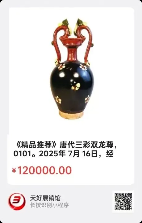 唐代三彩双龙尊,双龙耳尊是唐代流行的瓶式。此瓶口沿外翻,细颈,长圆腹,平底。口、肩连以双条形龙柄,龙张口叼住瓶口,龙柄上饰三个圆珠,上半身施白、绿、黄相间三彩釉。长圆腹施深蓝釉,唐三彩的蓝釉,为中亚地区进口的钴料,相传当时比黄金还珍贵。俗称:“三彩带蓝,价值连连。”此蓝釉色深沉近墨黑,间隔点有梅花斑点,每个梅花斑点下方有垂釉现象。接近底部无釉,平底底部无釉露胎,胎质白净、细腻。三彩双龙耳瓶,以两个对称的双龙衔住瓶口为柄,龙炳根处垂釉接近器底,造型优美高雅,制作相当精致。尺寸: 高33.8厘米,口径7.8厘米,底径8.8厘米,双龙间距12.8厘米,肚围48.5厘米。2025年 7月 16日,经天好评审团评审,以6票优势荣登精品榜,获第179期天好海选精品。来源0101.V.