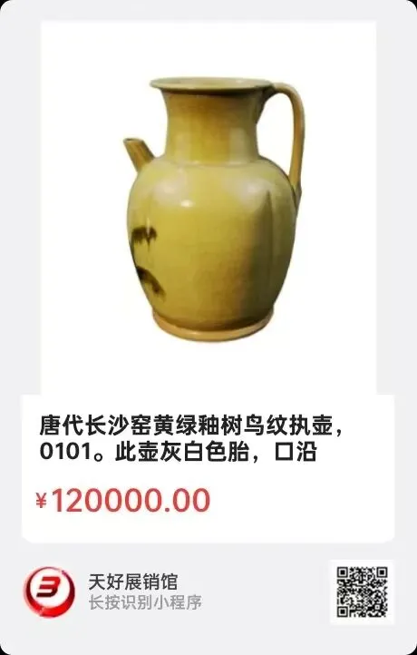 唐代长沙窑黄绿釉树鸟纹执壶, 此壶灰白色胎,口沿外翻,口沿处有一细微脱釉,属于自然脱落,照片中有显示。粗高颈,溜肩,筒形腹,最大径在腹的上部,下腹略内收,六棱形短流,与流相对应的一边饰扁带形把手,大平底,底边有削棱一圈。器身外施绿釉内施釉颈部,器外施釉不及底,均匀素净。腹有四条内凹直条纹,呈瓜棱状,在腹部用绿彩勾绘一鸟立树枝状,鸟首高昂朝天,通体施青黄釉,整器釉面处均有细微开片,长沙窑在瓷器装饰方面有特殊成就,釉下彩是其首创。尺寸:口径9.8厘米,高21厘米,底径10.6厘。来源:0101。V.