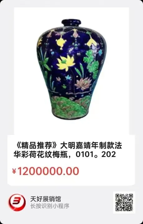 大明嘉靖年制款法华彩荷花纹梅瓶,珐华器最早出现于元代,明代大量流行,通常有陶胎和瓷胎两种,瓷胎珐华产于景德镇,这件梅瓶就是瓷胎。此件嘉靖时期的珐华彩梅瓶是一种低温色釉,瓷胎表面使用特制的泥浆管挤出内含牙硝为助熔剂的泥浆,勾勒出纹饰的凸线轮廓,然后以素红色、孔雀绿色、黄色、浅粉红色等彩料填出纹饰色彩,最后经二次入窑低温烧成。此件法华彩梅瓶,蓝釉为底,唇口, 口部下方白釉处青花书写“大明嘉靖年制”官款。短颈 丰肩 ,颈部下方双圆圈内绘八朵云间纹,肩以下往内收,肩处绘璎珞纹,近足处绘海水纹,腹部主题纹饰为满池莲荷纹,池塘中的水草茂盛,舒展的荷叶,盛开的荷花,底足露胎,采用先勾勒轮廓 再用三彩填色,纹饰凸出瓷胎表面,立体感强,装饰效果强烈,器形大气美观,工艺精美,色彩鲜明。尺寸;高40厘米,口径8厘米,底径16.7厘米,胸围90厘米。2025年 6月 11日,经天好评审团评审,以7票优势荣登精品榜,获第174期天好海选精品。来源0101.V.