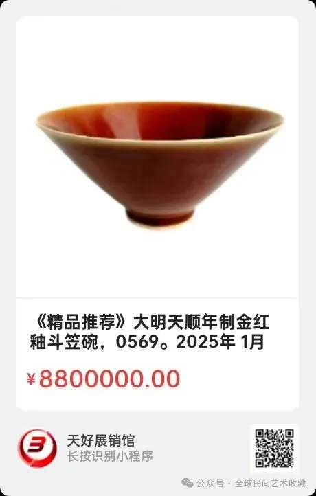 大明天顺年制金红釉斗笠碗,高6.6㎝,口径14.9㎝,足径4.5㎝,此碗呈斗笠形,撇口,斜腹,圈足,青花双圈“大明天顺年制”楷书六字款。造型精致,线条流畅。金红釉是以金为着色剂,经低温烧成的粉红黄色釉。在釉中掺入黄金烧成后就是胭脂红,呈浅粉红色,色如浓艳的胭脂红色。金红釉的烧制创始于明天顺时期,康熙、雍正、乾隆时期烧制更为成熟,成为宫廷御用瓷器中的名贵品种。此碗带款“天顺年制”青花双圈款,天顺款很少见到。如今,明代金红釉瓷器已经成为收藏家们追逐的珍品,其价格居高不下。然而,由于年代久远,保存完整的明代金红釉瓷器十分稀少,加上带罕见天顺官款,因此具有很高的历史、艺术和收藏价值。2025年 1月 22日,经天好评审团评审,以6票优势荣登精品榜,获第160期天好海选精品。来源0569.V.