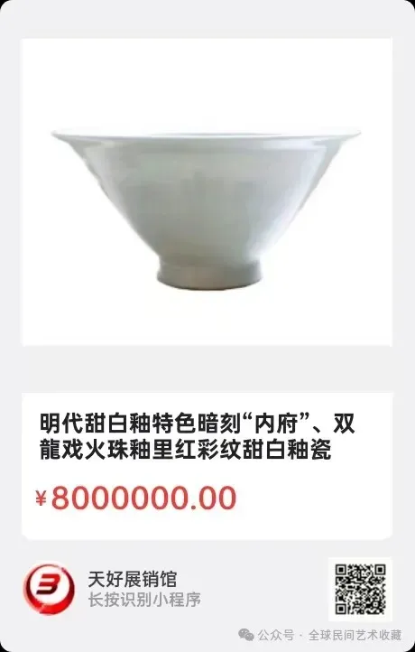 明代甜白釉特色暗刻“内府”、双龍戏火珠釉里红彩纹甜白釉瓷斗笠碗,(高70 m /m,直径160 m /m,足径45m /m,壁厚1 m /m左右,重:220g),因此,此暗刻“内府”斗笠碗确实极为珍贵。来源1384.V.
