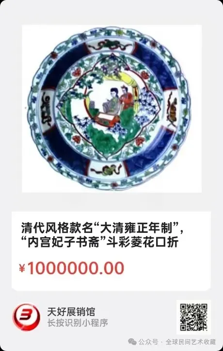 清代风格款名“大清雍正年制”,“内宫妃子书斋”斗彩菱花口折沿瓷盘,(高50m /m;直径270m /m;足径175m /m)。本款名“大清雍正年制” “内宫妃子书斋”斗彩菱花口折沿瓷盘,盘口呈盛开的菱花形,折沿,弧腹下敛,底承圈足,盘背底面施以白釉并塑凸纹一圈十分醒目,釉色白中闪青,古朴清丽,晶莹丰润,清新养目,极具古意。盘背足露胎与釉面交接处呈现一圈火石红,盘背足底有褐色铁锈斑点,用手拭之有凹凸不平的感觉,轻轻弹叩盘体时所发出的声音清脆、悦耳,说明盘体瓷胎细致密实,无裂损,在高温烧成时,瓷胎的瓷化相当到位。十分难得。来源1384.V.