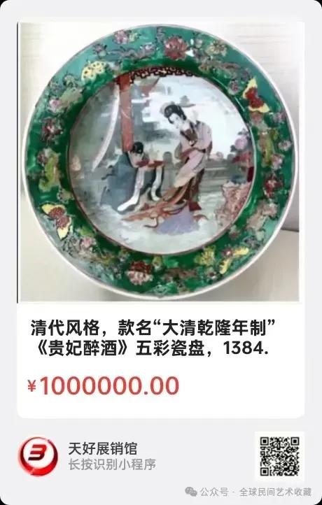 清代风格,款名“大清乾隆年制” 《贵妃醉酒》五彩瓷盘,(高25m /m,直径270m /m,底径165m /m)。在此景秀绵绵的百花丛中,再巧妙的配以“双(麒)麟护宝”、“龙凤献桃”、“瓜瓞(蝶)绵绵”,更呈递着大唐国富民强的太平盛世。 来源1384.V。