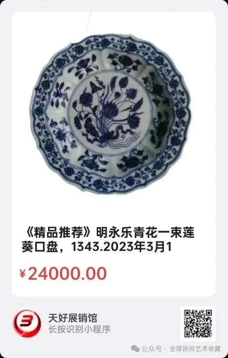 明永乐青花一束莲葵口盘,尺寸:口径210,高4.0,底径14.2,藏品胎质精细,青花浓艳,釉色莹润亮丽,是个不可多得的永乐青花盘小精品,2023年3月15曰,经天好评审团评审,以6票优势荣登精品榜,获第七十三期天好海选精品。来源:1343.V.