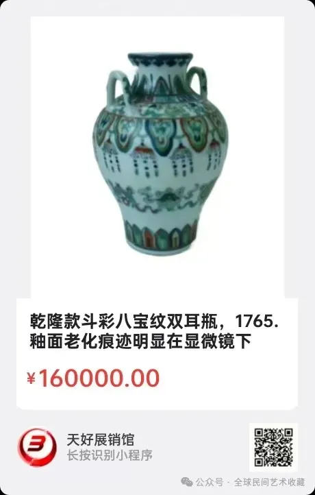 乾隆款斗彩八宝纹双耳瓶,高142毫米、口45毫米、腹部98毫米、圈足56 毫米,釉面老化痕迹明显在显微镜下清晰可见彩釉细小开片,釉面老化变色气泡遍布器身。来源1765..V.