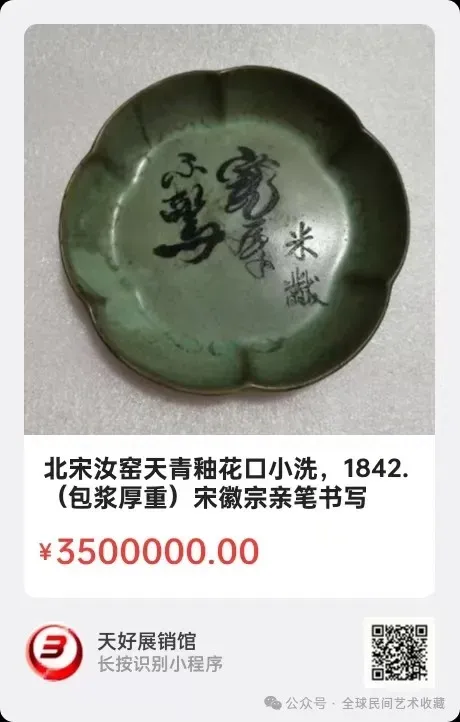 北宋汝窑青釉丙字款笔洗:尺寸:口径14.6厘米,高3.8厘米,底足10.1厘米。该北宋汝窑笔洗为宫廷皇家御用,好东西不用多解释了,行家自然会看得懂。有检测报告,来源1515.V。