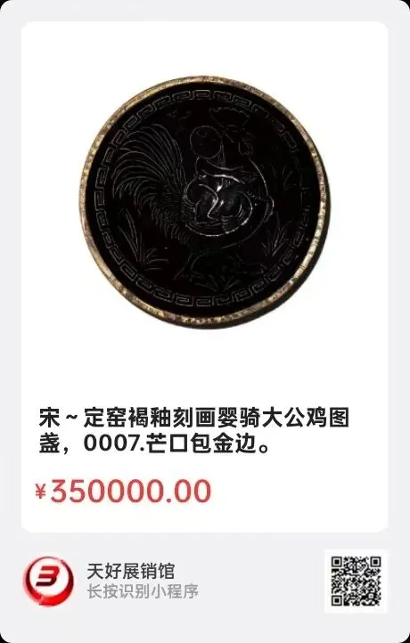 宋~定窑褐釉刻画婴骑大公鸡图盏,口径14,芒口包金边,来源:0007。V.