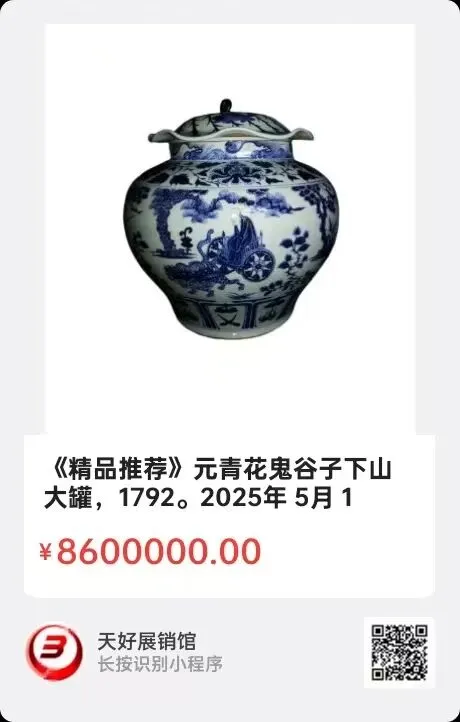 元青花鬼谷子下山大罐,《鬼谷子下山》元青花大罐是全球仅存的八件元青花人物故事瓷之一,瓷罐高42cm,口径24.5cm,足径23cm,素底宽圈足,直口短颈,唇口稍厚,溜肩圆腹,肩以下渐广,至腹部下渐收,至底微撇。绘有“鬼谷下山”图,传神生动,画工细腻,堪称元青花绝世珍品。2025年 5月 14日,经天好评审团评审,以6票优势荣登精品榜,获第171期天好海选精品。来源1792.V.