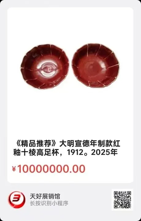 大明宣德年制款红釉十棱高足杯,口径,15公分左右,高度,11公分左右,底足,0.45公分左右。宣德红高足杯一对非常难得,颜色亮利,红色在当时烧造难度很高,保存到现在不可多得!明代宣德红釉瓷器本身就极为珍贵,烧成条件苛刻,且流传至今数量稀少,高足杯的造型又使其更具独特性。从近年来的二级巿場趋势情况来看,宣德红釉高足杯一直是收藏家和投资者追捧的对象,市场需求极为热捧。2025年 5月 28日,经天好评审团评审,以7票优势荣登精品榜,获第173期天好海选精品。来源1912.V.