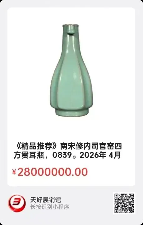 南宋修内司官窑四方贯耳瓶,高22.5公分,宽10.5公分。2026年 4月1日,经天好评审团评审,以6票优势荣登精品榜,获第204期天好海选精品。来源0839.V。