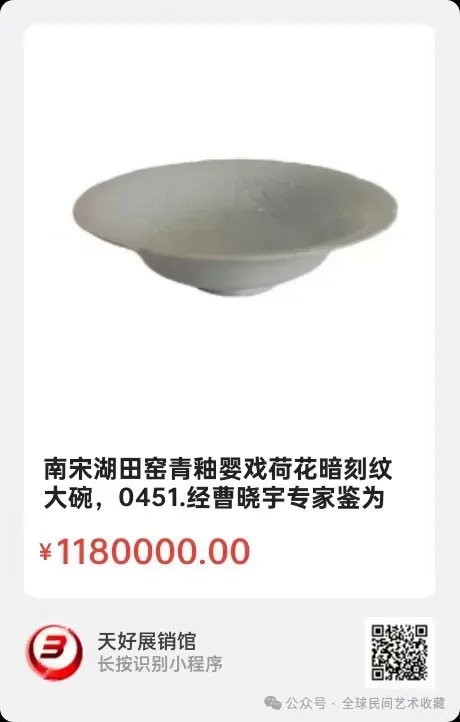 南宋湖田窑青釉婴戏荷花暗刻纹大碗,高.6.3cm;口径22cm.底径6.5cm,经曹晓宇专家鉴为真品。来源0451.V.
