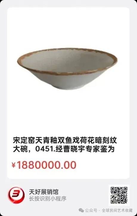 宋定窑天青釉双鱼戏荷花暗刻纹大碗,高.5.7cm;口径19.7cm.底径7.3cm,经曹晓宇专家鉴为真品。来源 0451 .V.