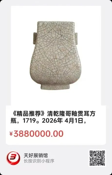 清乾隆哥釉贯耳方瓶。瓶高21.5厘米,该瓶造型优美,端庄大气,胎体较厚,釉质肥厚亮丽,采用铁胎制作方式。全手工制作,修足规范精细。胎质坚硬,底部雕刻乾隆御提詞是标准清代乾隆哥窑官窑的制作书写方式。釉面经过几百年的蒼伤釉面有细腻的深浅开片,金丝铁线明显,整体包浆醇厚自然到代!是件难乾隆时期的贯耳方瓶真品,珍品!精品!全美品!罕见的品种!根据例年国内拍买成交的保守估价。2026年 4月1日,经天好评审团评审,以7票优势荣登精品榜,获第204期天好海选精品。来源1719.V。