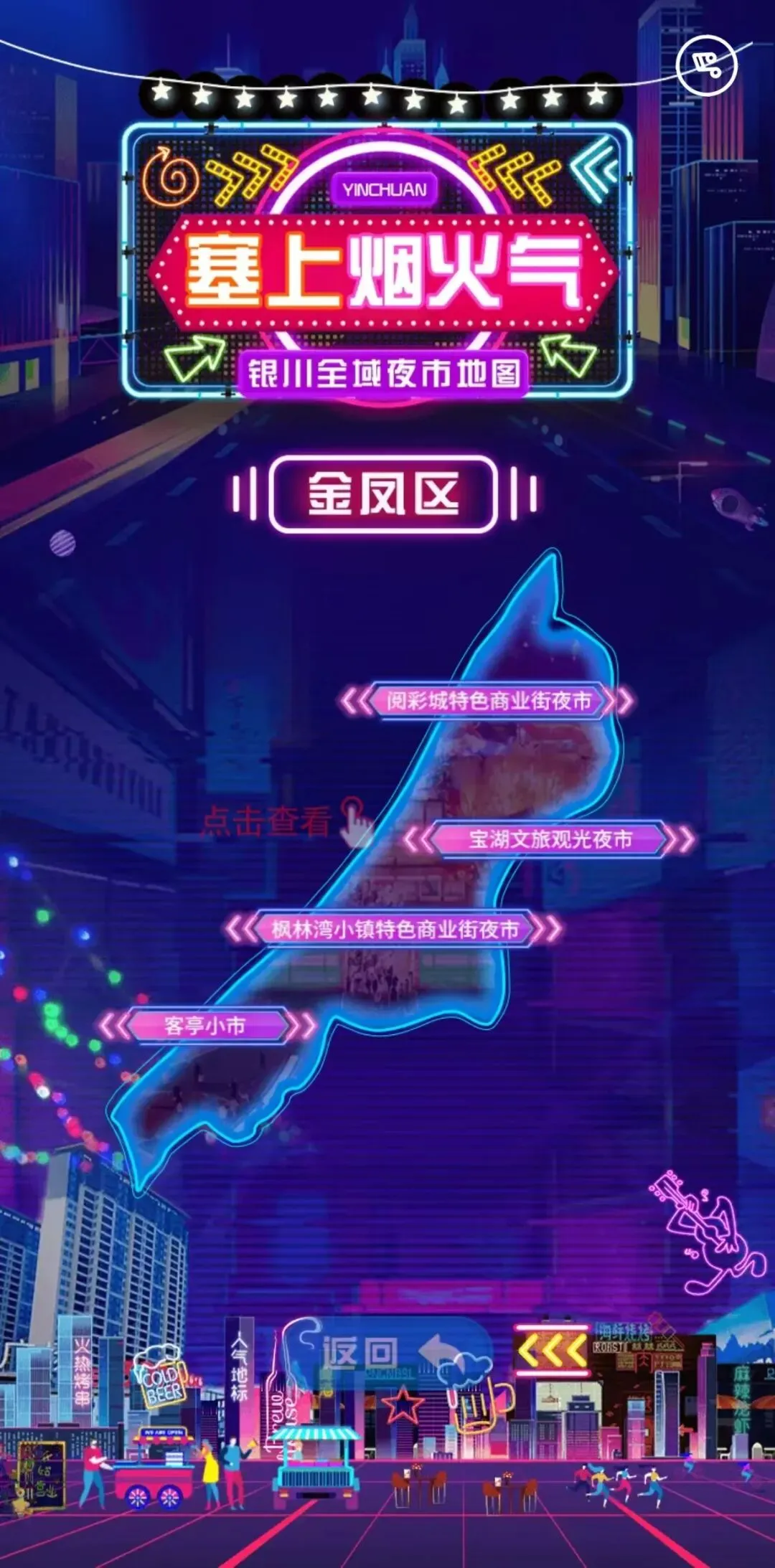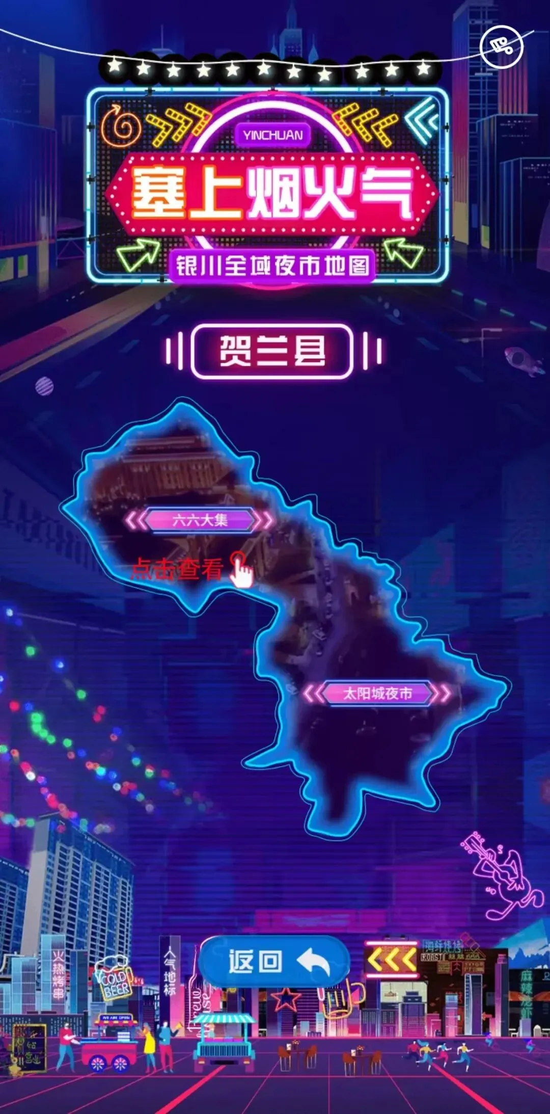 银川全域地图直观呈现,标志性元素清晰区分三区两县一市,直接点击对应区县,就能进入下一层。