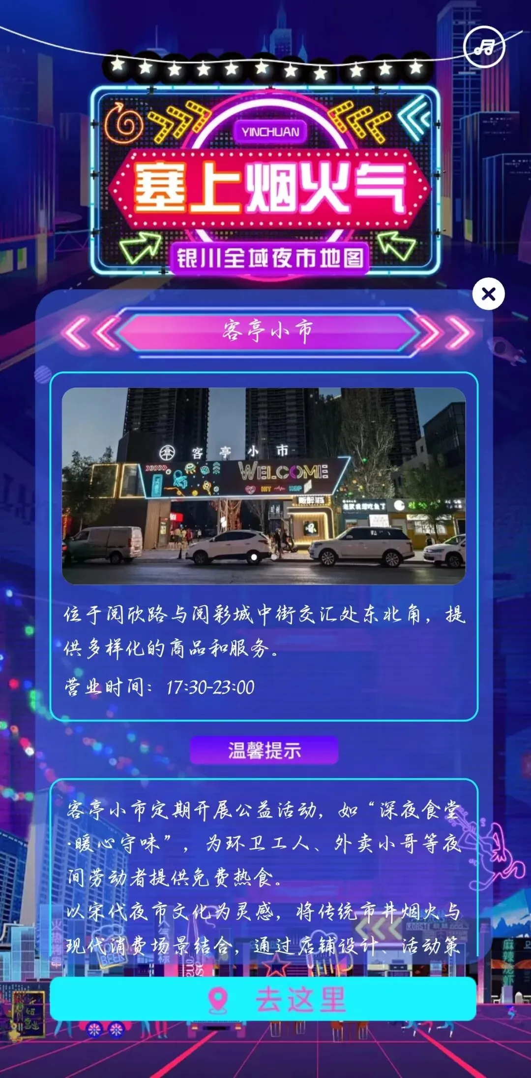 点击点标就能弹出“夜市详情页”——这里有场景展示图,还有详细地址、营业时间。最贴心的是还有一键导航功能,点击即可跳转高德、百度地图,哪怕是藏在小巷里的老夜市,也能精准找到,完全不用怕“迷路找夜市误了饭点”。