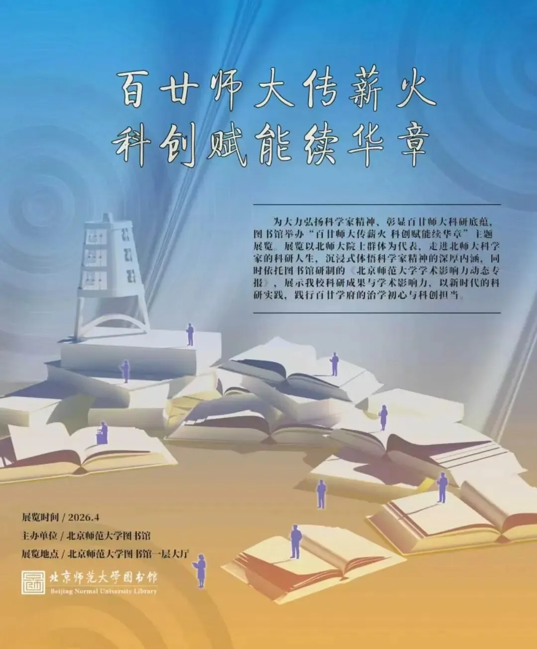 为大力弘扬科学家精神、彰显百廿师大科研底蕴,图书馆举办“百廿师大传薪火 科创赋能续华章”主题展览。展览以北师大院士群体为代表,走进北师大科学家的科研人生,沉浸式体悟科学家精神的深厚内涵,同时依托图书馆研制的《北京师范大学学术影响力动态专报》,展示我校科研成果与学术影响力,以新时代的科研实践,践行百廿学府的治学初心与科创担当。