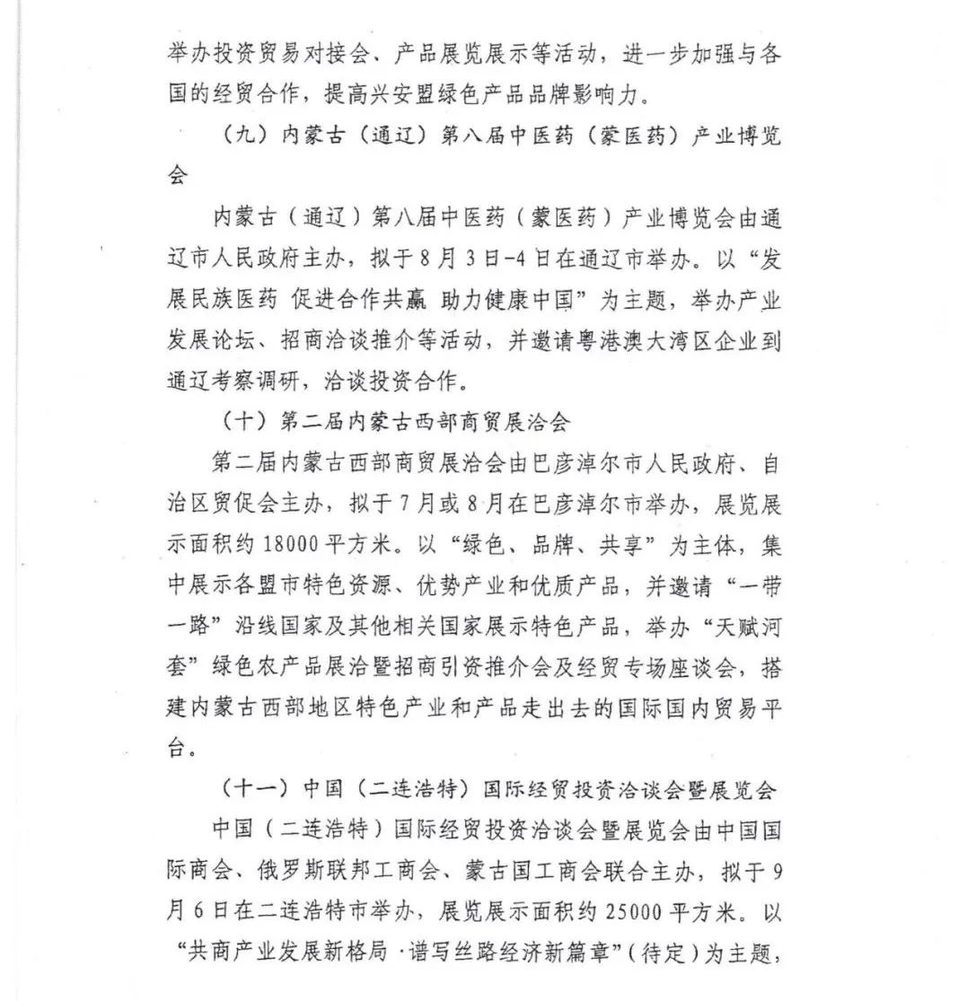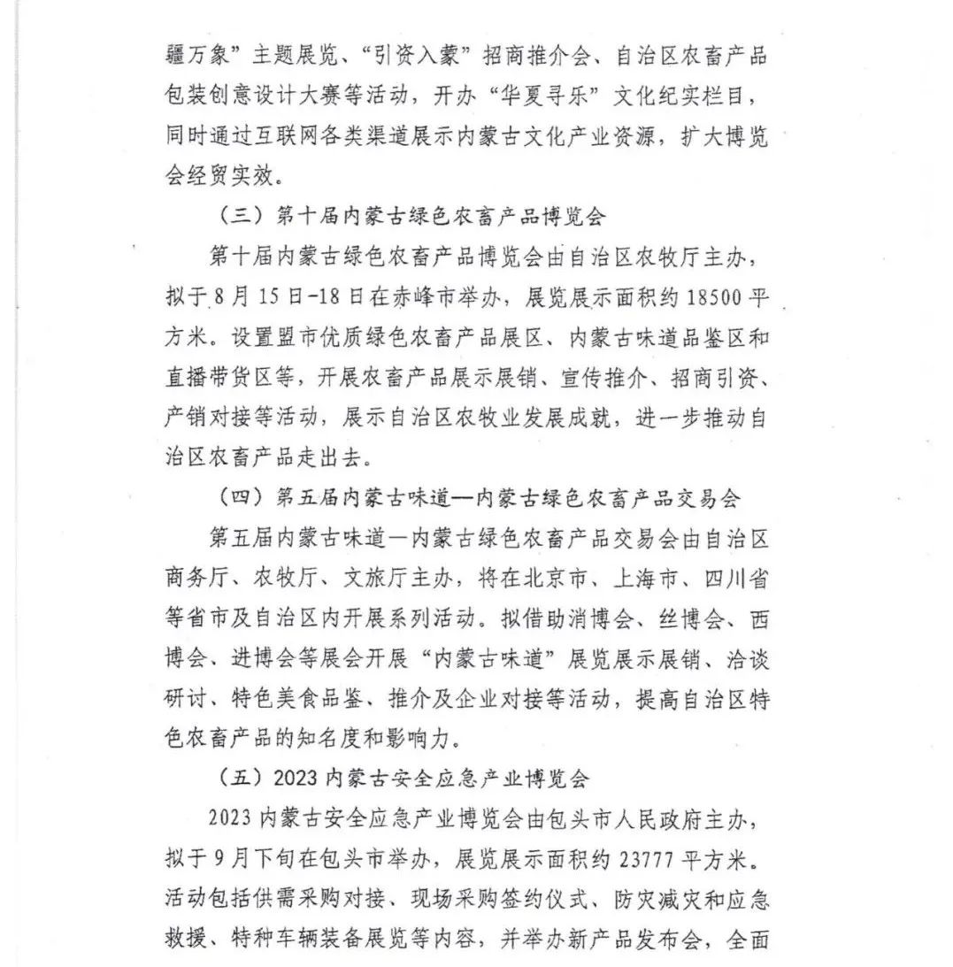 根据四子王旗政府办公室转发的《内蒙古自治区商务厅关于2023年自治区拟举办大型展会情况的报告》(内商服贸字﹝2023﹞194号)文件精神,决定开展四子王旗境内企业参加2023年自治区拟举办大型展会预报名工作。现将相关展会信息转发给你们,请有意愿参加相关展会的企业将电子版本参展预报名回执发送至szwqswj@163.com。四子王旗商务局