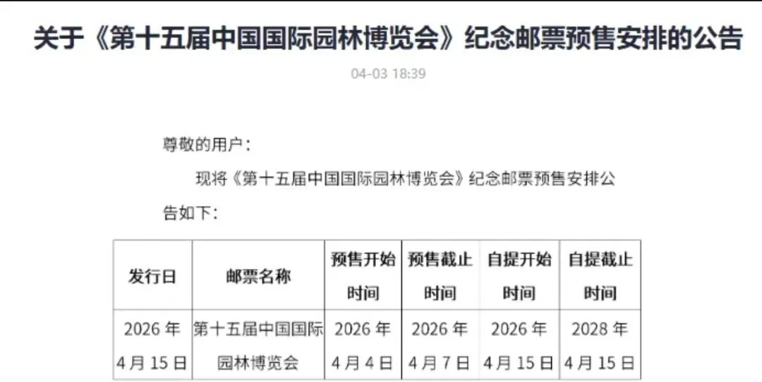 集邮圈重磅消息:中国邮政定于2026年4月15日发行2026-3J《第十五届中国国际园林博览会》纪念邮票,网厅自提预售于4月4日点正式开启,每人限购8套。与此同时,园博会护邮卡、《中国篆刻(三)》护邮卡预约信息在中国集邮网厅相继公布,作为邮票收藏配套附件同步登场。