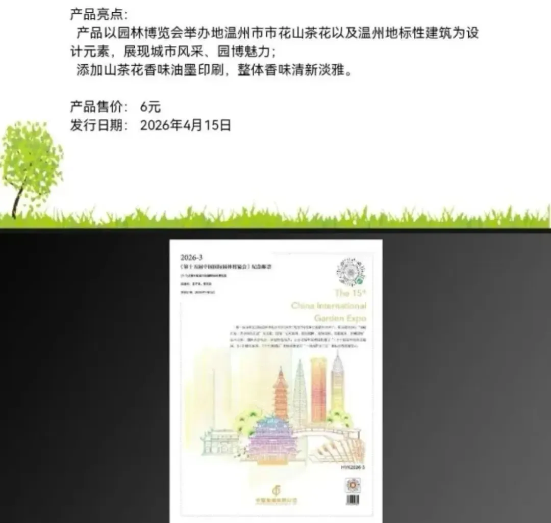 作为新邮配套附件,温州园博会护邮卡同步推出,以温州市花山茶花与城市地标为设计元素,风格清新,售价20元/套,将于4月15日发售。
