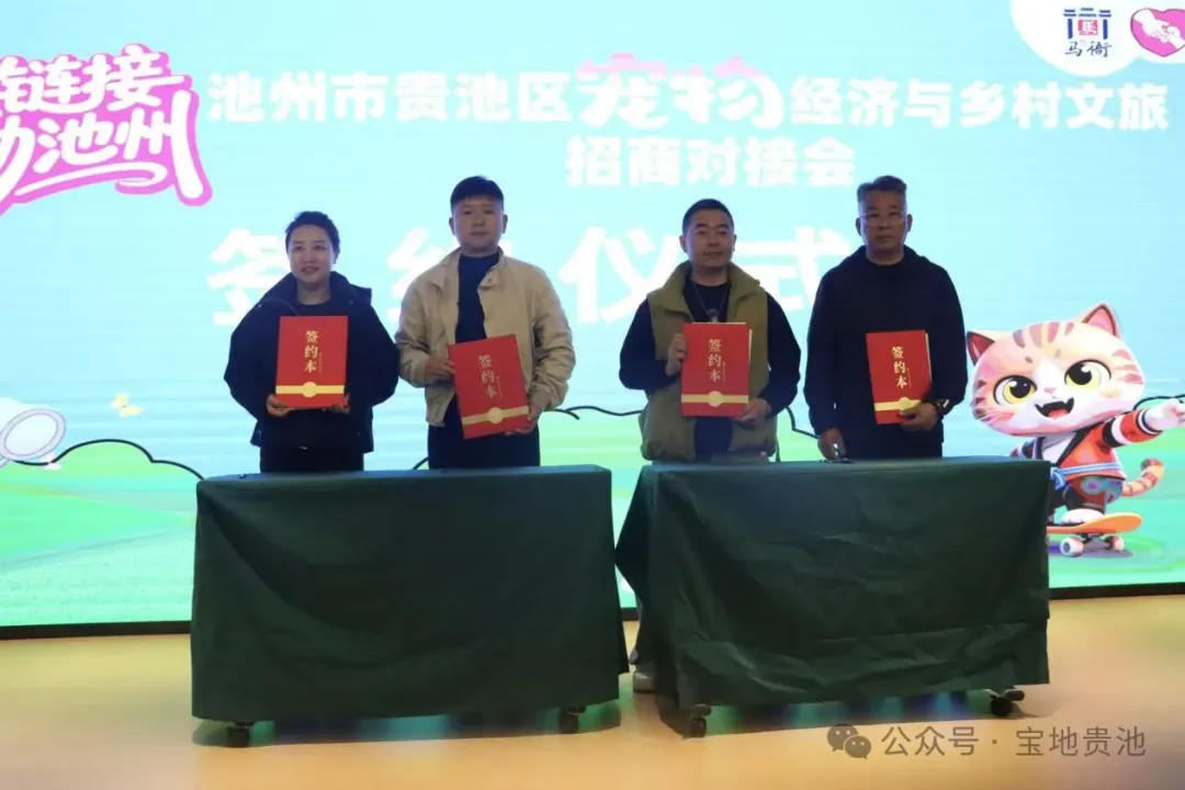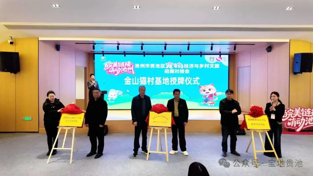 活动现场,精彩的非遗乌石手狮舞以及喵星人投票环节接连上演,憨态可掬的金山猫村专属IP“小金牙”也正式亮相,现场各种软萌可爱的猫咪更是引得大家纷纷驻足围观,气氛十分热烈。在推介环节,区文旅局围绕全区优质文旅资源,重点推介了涵盖康养文旅、民宿度假、文化体验等多元业态的招商项目,全方位展现了贵池文旅产业的发展潜力。马衙街道文旅推荐官则聚焦金山猫村,从打造历程、特色业态、运营成果与招商规划等方面进行详细介绍,生动呈现了“文创+宠物经济”乡村振兴新路径的活力与魅力。随后,多个宠物产业链配套项目、乡村文旅融合项目现场签约,研学实践、校企实训、产业合作等多类基地同步揭牌,为贵池宠物经济与乡村文旅融合发展再添新动能。