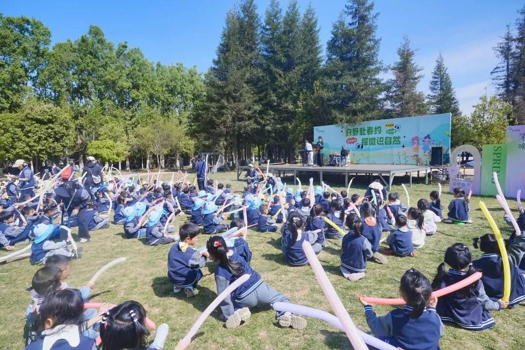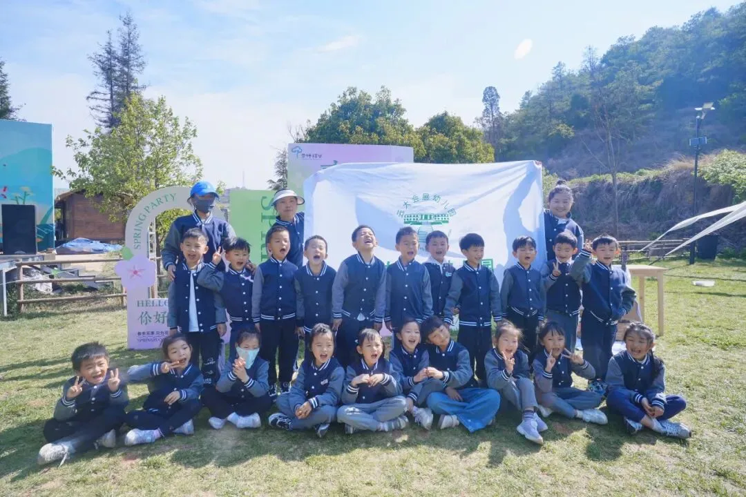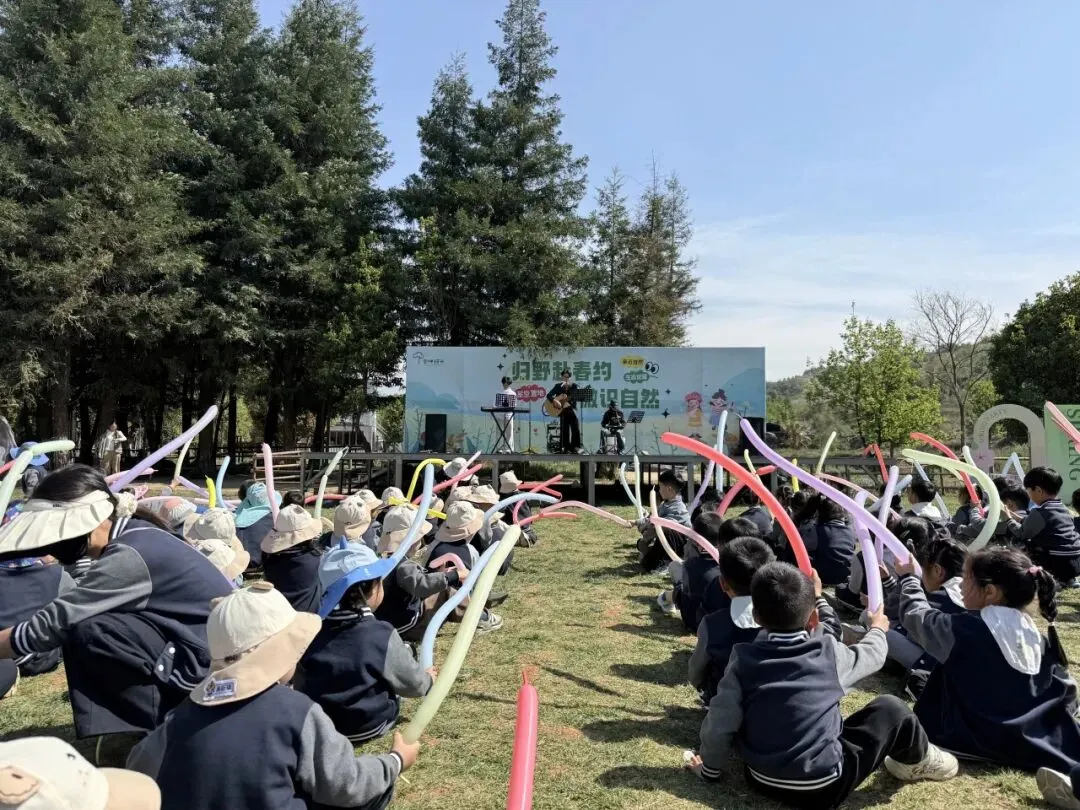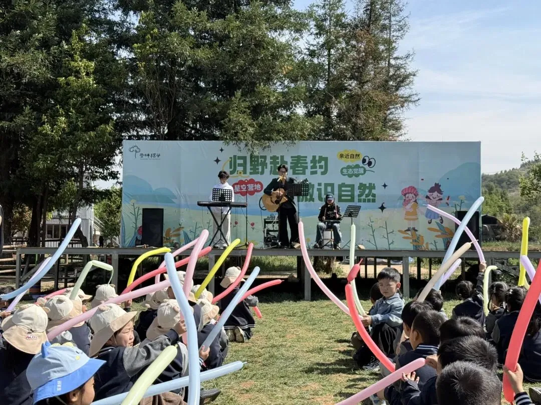 现场特邀乐队倾情演唱,轻快治愈的旋律在山野间回荡,明快的节奏、动听的歌声,瞬间点燃全场氛围。孩子们围坐草坪,跟着音乐轻轻拍手、摇晃身体,时而跟着哼唱,时而开心欢笑,歌声、笑声、音乐声交织在一起。在乐队的带动下,全园小朋友一同合唱,氛围感拉满,春日的美好与童真,在歌声里温柔流淌。