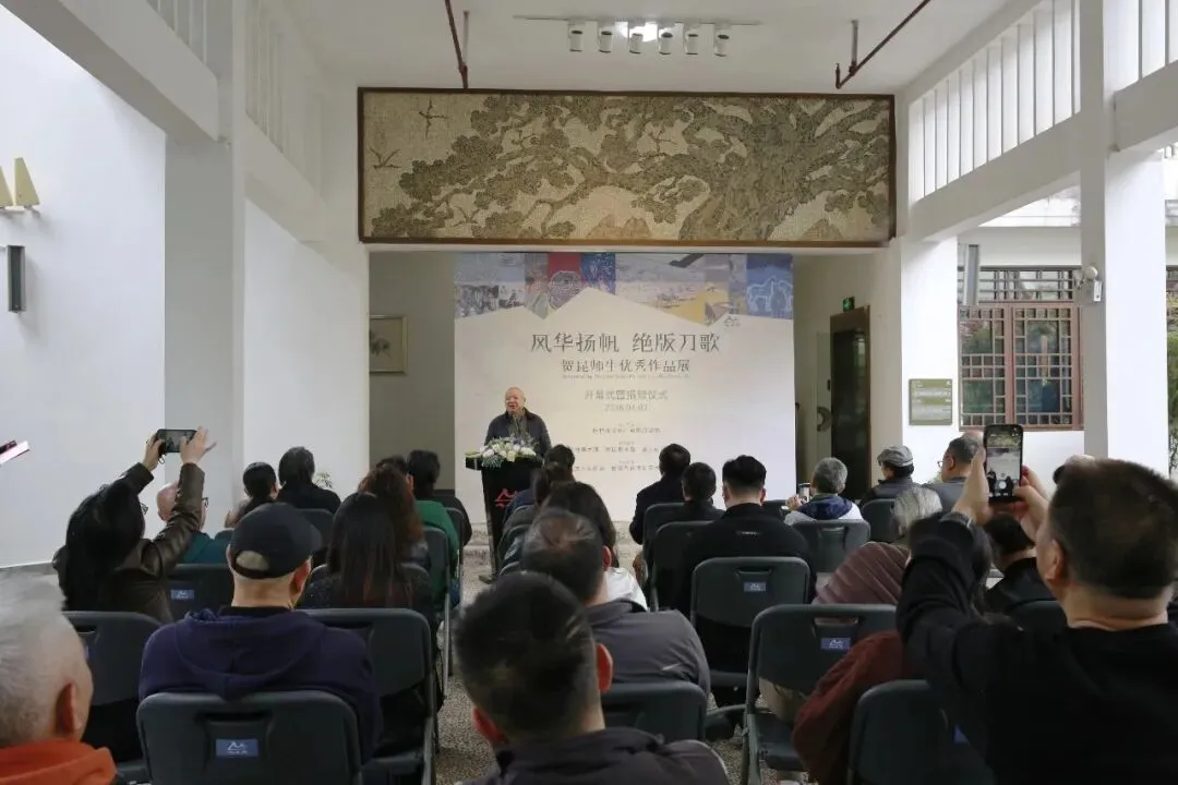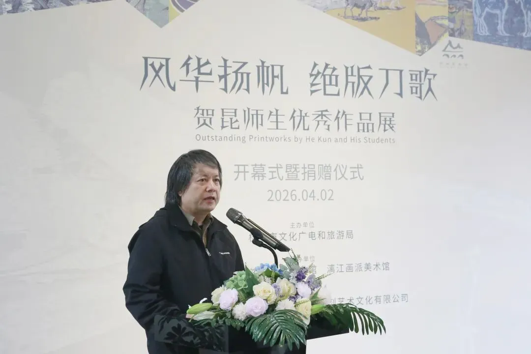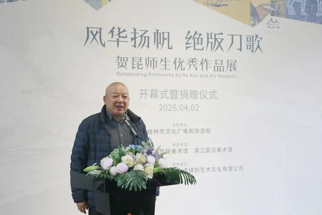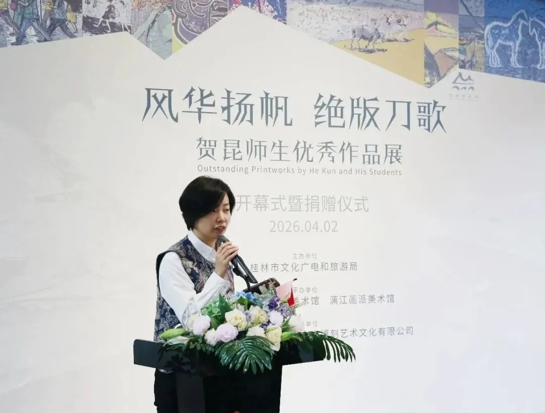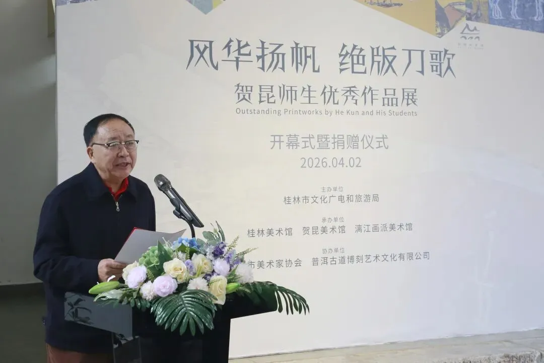 2026年4月2日上午,由桂林市文化广电和旅游局主办,桂林美术馆、贺昆美术馆与漓江画派美术馆共同承办的“风华扬帆 绝版刀歌——贺昆师生优秀作品展”在桂林美术馆正式开幕。展览共展出贺昆及其学生创作的百余件精品,集中呈现绝版木刻艺术在不同代际之间的延续与变化。