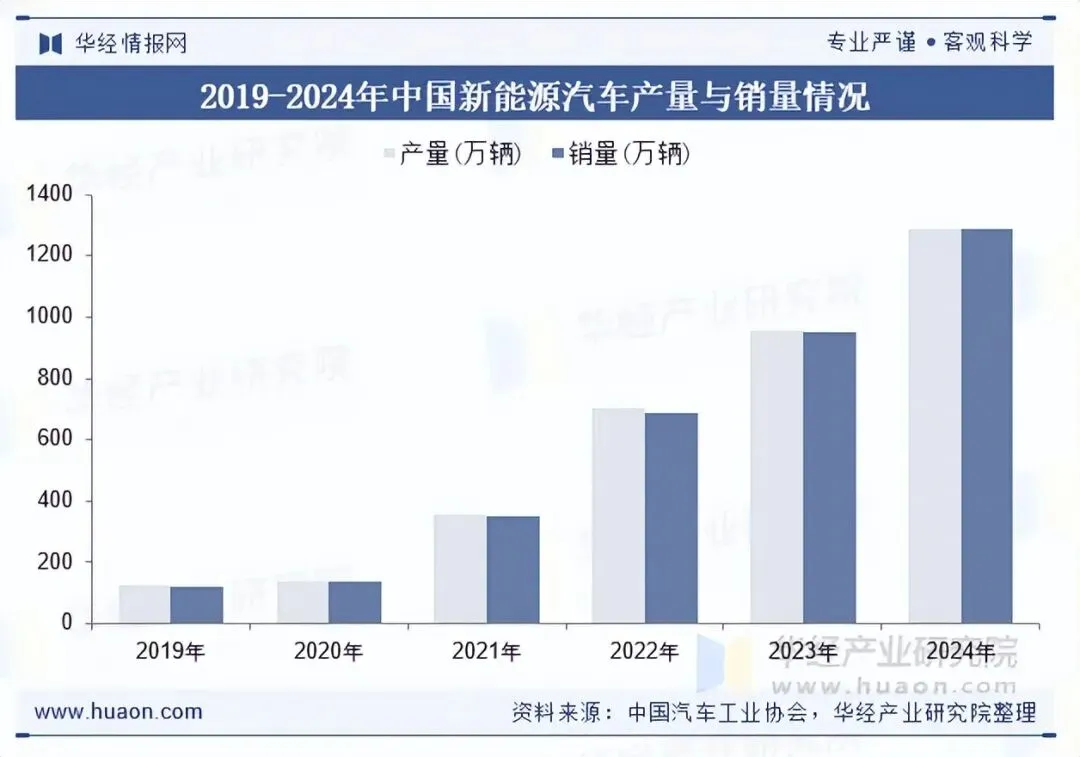 烧结钕铁硼作为新能源汽车驱动电机的核心材料,凭借其高磁能积、高矫顽力、高剩磁等特性,显著提升了电机效率、缩小了体积、减轻了重量,并推动了新能源汽车的续航提升与轻量化设计。2024年,中国新能源汽车产量与销量分别为1288.8万辆和1286.6万辆,同比分别增长34.4%和35.5%。